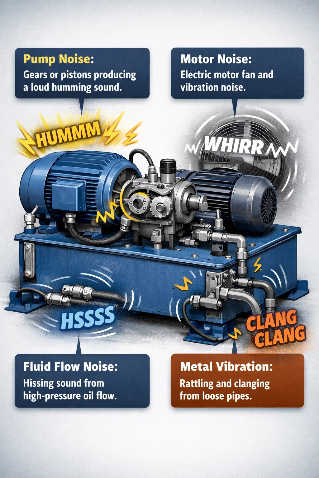 Гидравлические силовые агрегаты производят звук главным образом потому, что несколько основных компонентов работают одновременно: