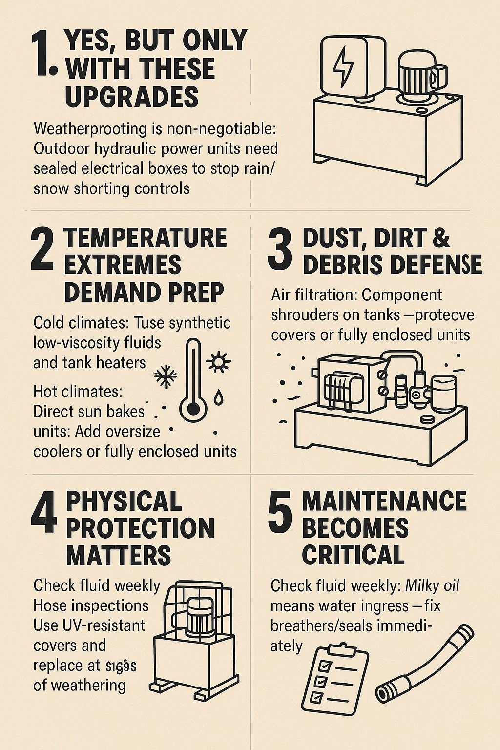 Защита от атмосферных воздействий не подлежит обсуждению: наружные гидравлические силовые агрегаты нуждаются в герметичных электрических коробках, чтобы предотвратить короткое замыкание под дождем или снегом. Открытые разъемы = ржавые катастрофы.