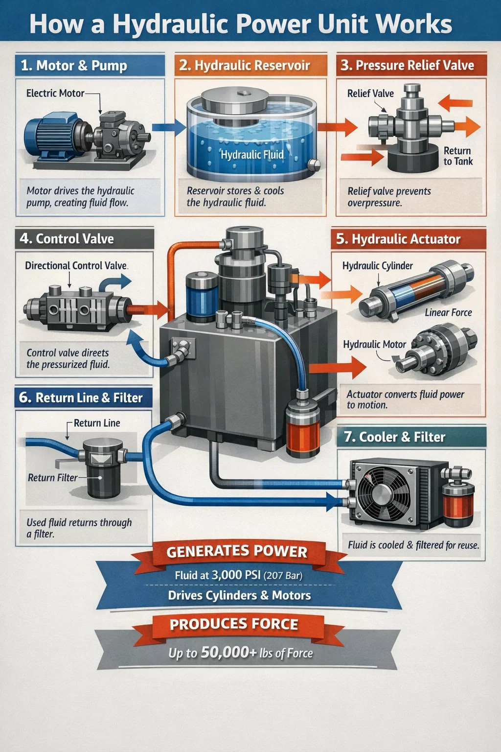 Понимание того, как работает гидравлический силовой агрегат, начинается с понимания того, что делает каждый основной компонент. Каждый HPU — от настольного агрегата емкостью 1 галлон до промышленного блока питания емкостью 500 галлонов — содержит одни и те же фундаментальные строительные блоки.