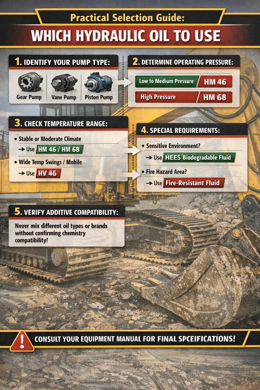 Никогда не смешивайте марки или типы гидравлического масла без подтверждения совместимости присадок обоих производителей. Даже два масла HM46 от разных поставщиков могут содержать несовместимые химические присадки.