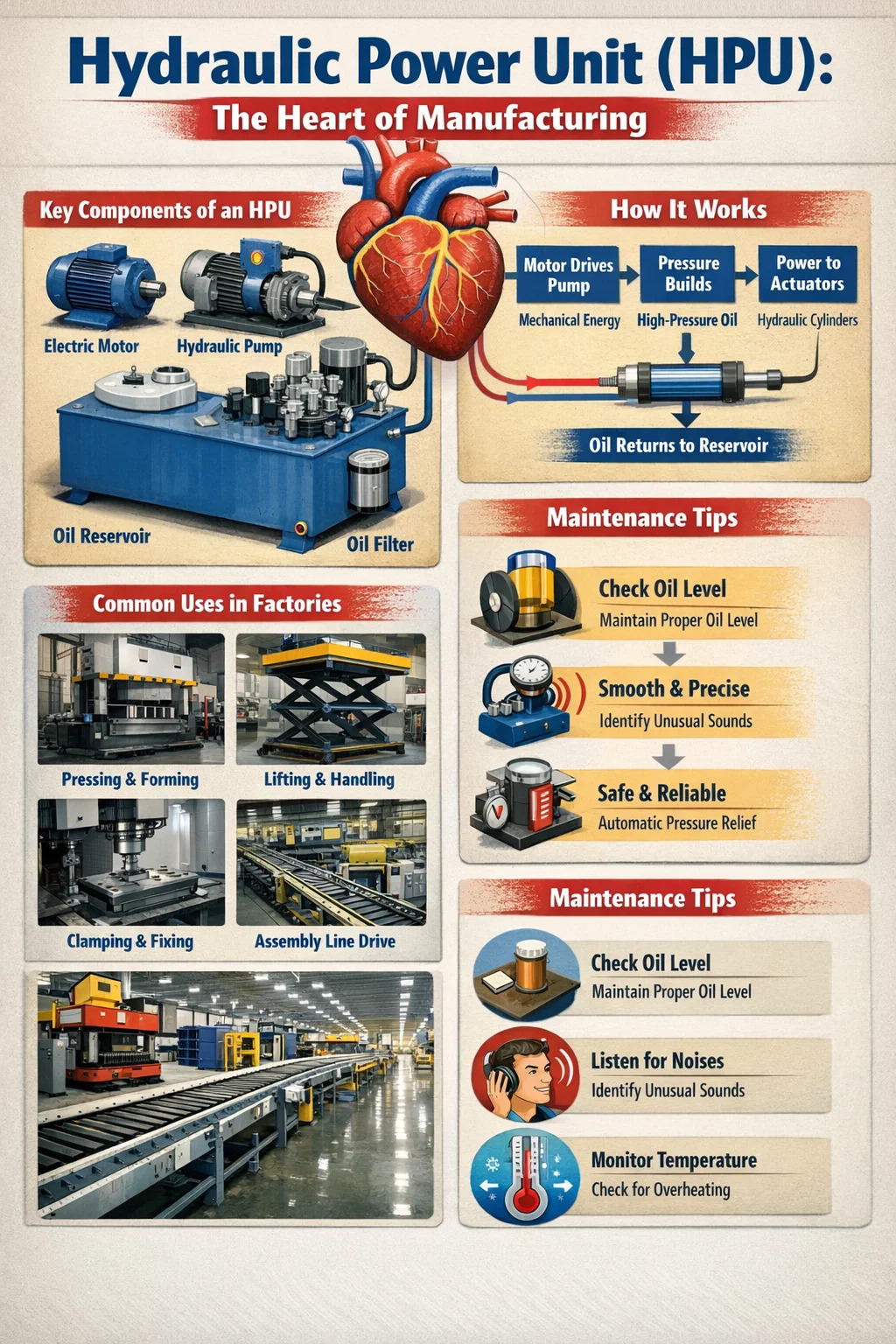 Проще говоря, если вы сравните заводское оборудование с человеческим телом, гидравлический силовой агрегат эквивалентно «сердцу». Он генерирует энергию путем сжатия жидкости (обычно гидравлического масла), а затем передает эту мощность частям, которые должны выполнять работу, например роботизированным рукам, прессам или подъемным платформам.
