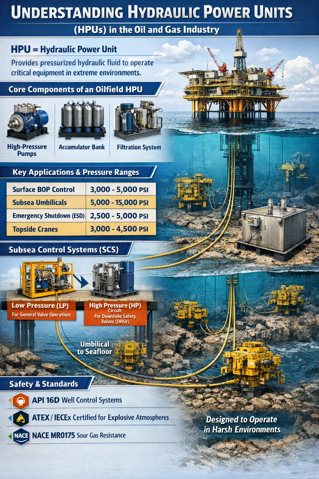 В системе используются насосы высокого давления (часто поршневые или диафрагменные), приводимые в движение электродвигателями или воздушными компрессорами. Отличительной особенностью этого сектора является Аккумулятор Банк . Это сосуды под давлением, которые хранят гидравлическую энергию с помощью сжатого азота. В типичной морской установке гидравлический силовой агрегат может поддерживать давление между 3000 фунтов на квадратный дюйм и 10 000 фунтов на квадратный дюйм , что позволяет немедленно активировать клапаны даже при полном отказе насоса.