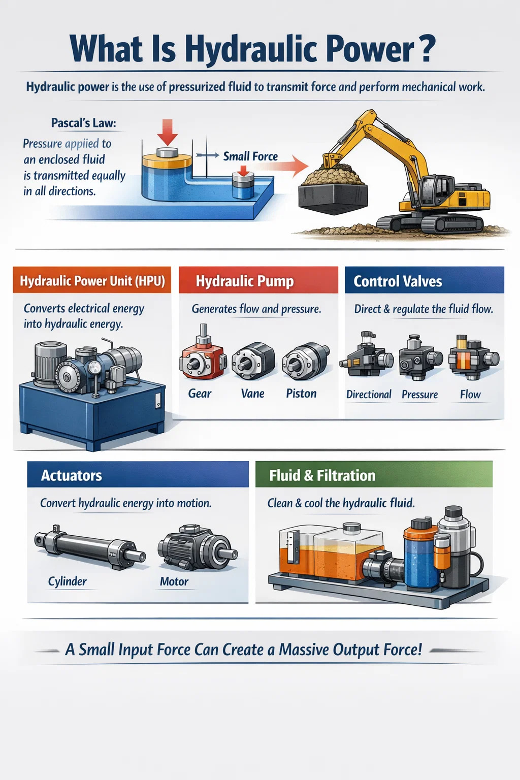 Гидравлическая энергия — это использование жидкости под давлением (почти всегда на масляной основе) для передачи силы и выполнения механической работы. Фундаментальным принципом является закон Паскаля: давление, приложенное к замкнутой жидкости, передается одинаково во всех направлениях. Это означает, что относительно небольшая входная сила, действующая на небольшую площадь поршня, может быть усилена до огромной выходной силы на большей площади поршня. С практической точки зрения именно поэтому компактный гидроцилиндр может поднять 30-тонный ковш экскаватора, зажать пресс с силой в тысячи килоньютон или привести в движение рулевой механизм корабля с точной, воспроизводимой точностью.